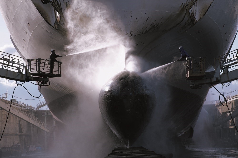 工作人員正以高壓清潔機器清洗船隻,將船移置船渠,一邊將航行時跑進船體內的海水排出,一邊以強力水柱把附著在船體上的垃圾、貝殼沖洗掉,如此一來,船在航行時才能更省力。