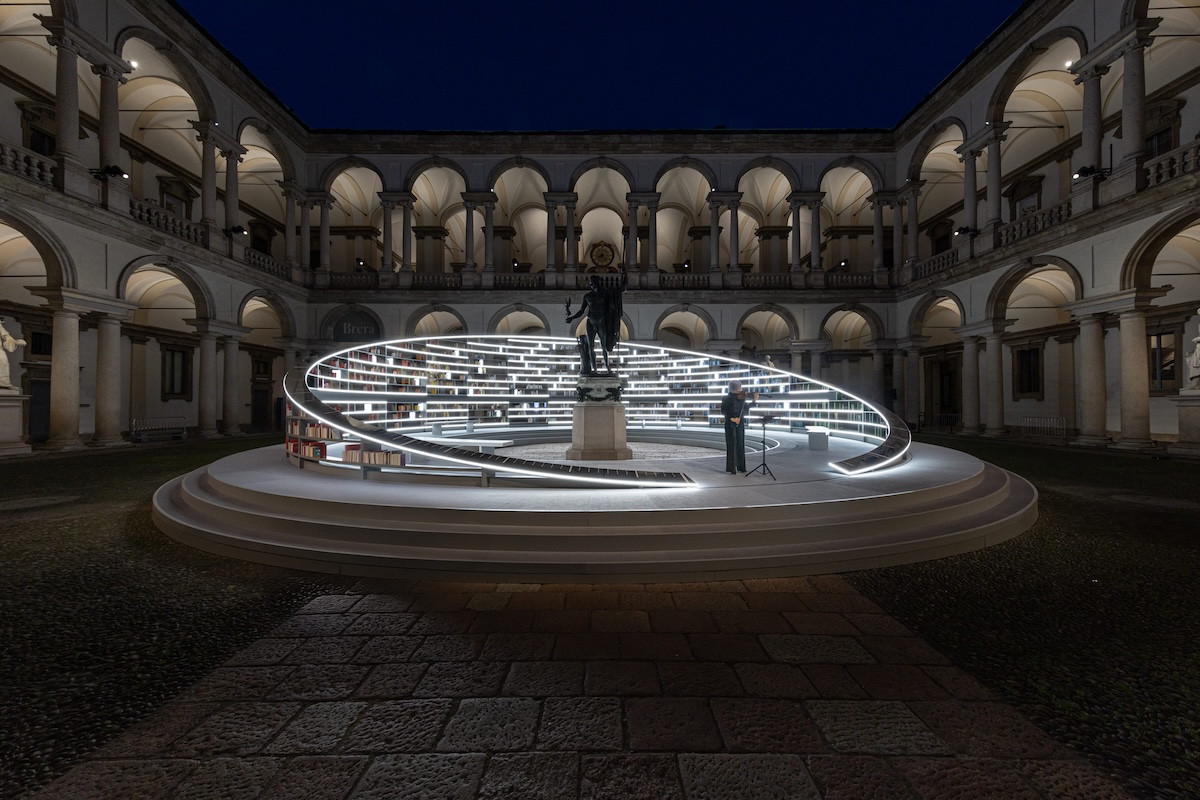 《光之圖書館》坐落於米蘭布雷拉畫廊的庭院中央,該建築擁有數百年歷史,集美術館、圖書館與美術學院於一地。其靈感來自義大利作家Umberto Eco的一句話:「書籍是心靈的指南針,指向無數等待探索的世界。」對於Devlin而言,圖書館是靜謐而充滿能量的場域,讓思想和想像力在其中翱翔;而這座《光之圖書館》的動態變化,就像閱讀時在腦中不斷誕生的共鳴與聯想。