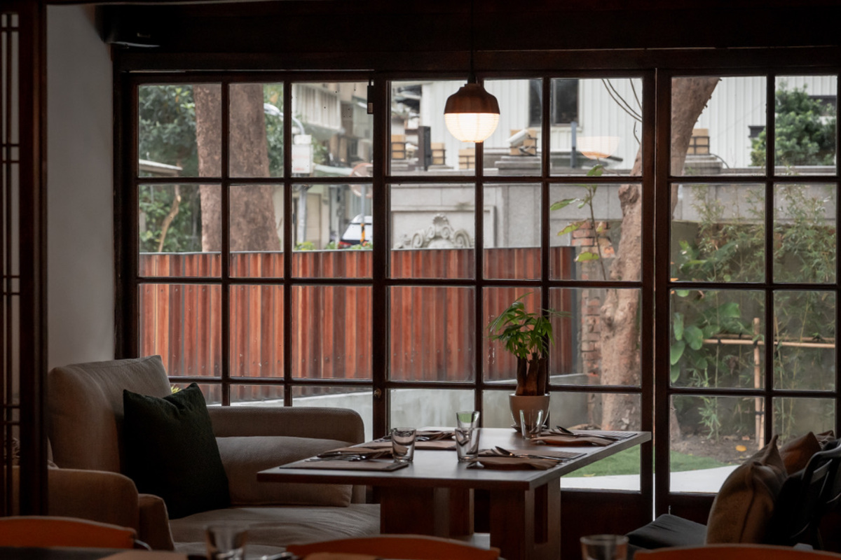 由於古蹟本體原本是宅第,並不符合現代餐飲營運需求,因此團隊先是調整了入口位置,將原本的後院改為餐廳主要出入口,接著在此新建廚房與吧台,並透過平頂過廊銜接新建物與古蹟本體,無縫串聯新舊空間。