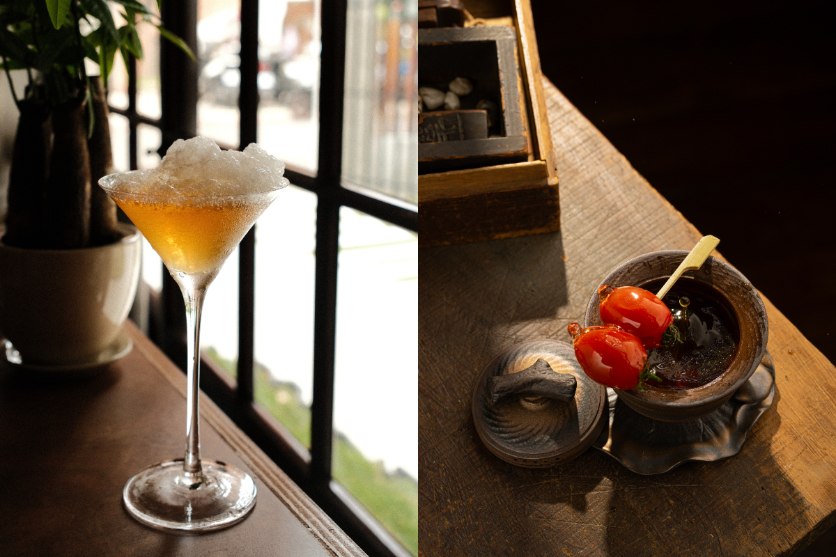 延續餐點以台灣本土食材為基底,酒單共17杯調酒也注入台灣意象,全天候供應。其中最特別的是「醴醞」,交織噶瑪蘭威士忌與阿里山烏龍茶香,融入蜜地瓜泥的甜韻,點綴些許梅粉與檸檬氣息,交織出獨特的味覺體驗。「蘋果派」則以蘭姆酒浸漬蘋果片佐肉桂香,風味溫潤又富層次變化。「酸梅湯」將金門高粱結合十多種中藥材熬製獨家酸梅湯,撒上話應子糖葫蘆與桂花,風味醇厚、尾韻清爽。