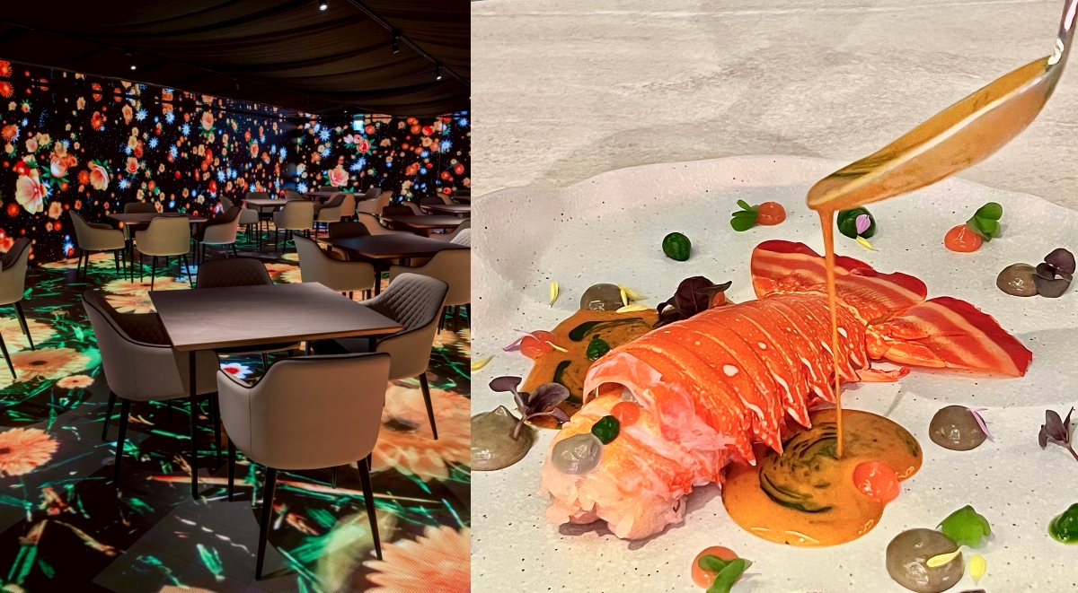 踏入餐廳,首先被全台首創的 Mini LED 沉浸式空間包圍。由聯嘉光電集團獨家研發的全環繞顯示技術,將牆面與地面化為動態舞台,光影隨著餐點的節奏轉換。這是一場將虛與實、視覺與味覺緊密交織的劇場級饗宴,讓人不由自主沉浸其中。