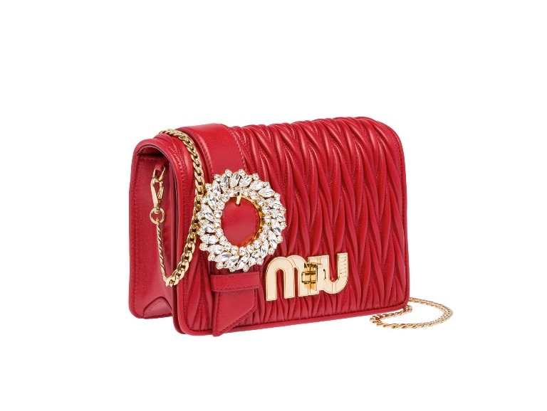 豔紅色的 My Miu Bag 也使用經典 MATELASSÉ 抓皺小羊皮革包面配上華麗寶石扣環,可輕易地搭配出高貴的完美造型,醒目的紅色總有一種可以增添氣勢的時髦魔力,與璀璨炫麗的寶石扣環完美結合,並且優雅地跳出人群。