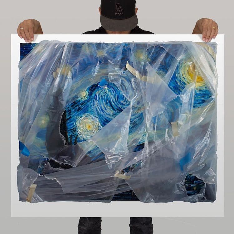 在這系列作品中,最令人驚艷的莫過於他重現了梵谷的《星夜》,Eley 不只準確的捕捉了後現代派的繪畫技巧,還在《星夜》外加上一層從中間被撕開的反光膜,栩栩如生的樣子,直逼電腦特效的水準。而另外一幅由 1920 年代畫家 Tamara de Lempicka 所創作的《The Brilliance》,帶著現代感、幾何風的裝飾藝術風格,到了他的手上,也是超水準發揮。