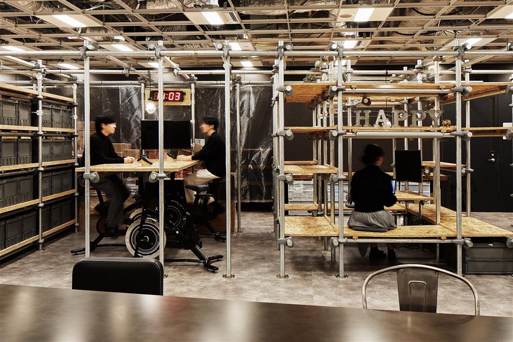 而正如「GARAGE」這個名稱所暗示的,每個部門的辦公空間或是會議、儲物空間、個人座位等,利用了傳統辦公室少見且容易拆解組合的鋼管為材,創造出猶如置身秘密基地的興奮感,再搭配可移動式桌椅,能在保持社交距離的同時,靈活改變辦公空間,加上定期實施的「部門搬遷」制度,也增加了與不同部門成員對話的機會。有趣的是,NISSIN GARAGE裡還設有以健身車當作椅子與結合類似網狀吊床的會議空間,以及可以試吃新產品、討論包裝設計的廚房,為工作增添幾分樂趣。