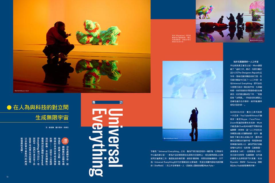 不過對大眾來說,最直覺的關切還是在於:到底要怎麼接近、理解這些科技藝術?一件件絢麗又繁複的科技藝術作品,抑或相對稀少的欣賞管道、非得藉由某種介面才能享有的體驗,在在揭示了這領域無可避免的門檻。因此專題鎖定大眾日常或娛樂會接觸到的類型,舉凡VR與AR電影、科技展演、沉浸式餐飲、AI軟體工具,更有Universal Everything、Six N. Five兩大國際新媒體藝術工作室現身說法。科技藝術家都很著迷科技嗎?創作結合科技真的比較厲害嗎?各種對科技藝術的好奇與質疑,各篇章裡有著各式回應,但真正的解答,得在每個人真正接觸後才會知道。