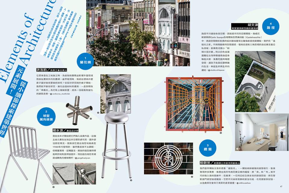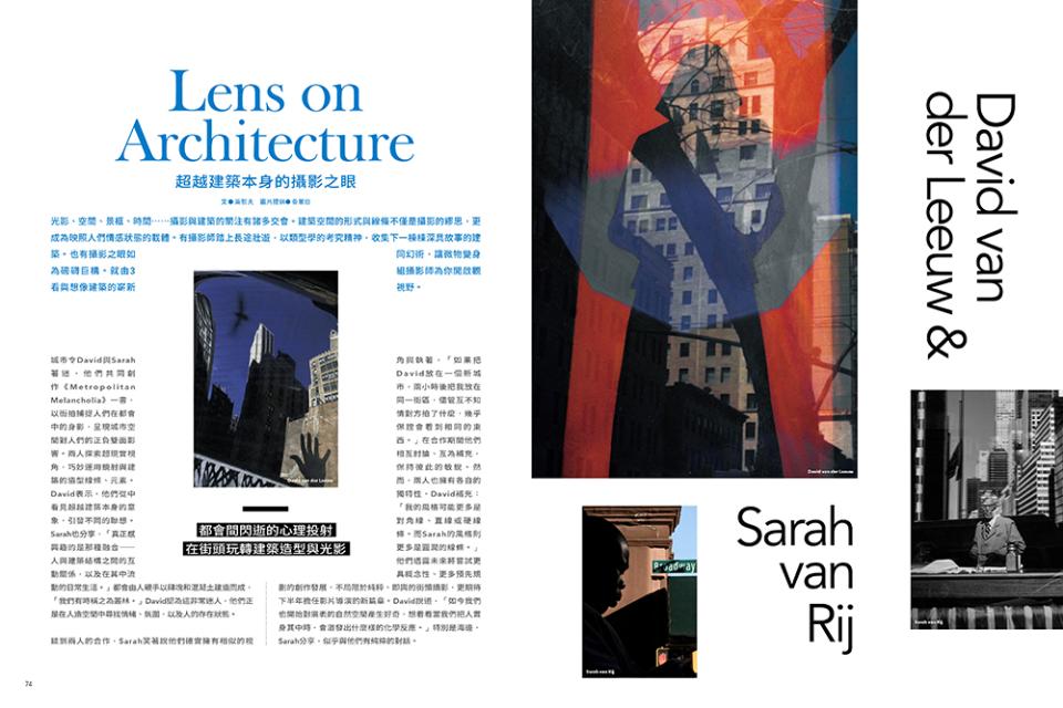 這次我們邀請20多位國內外、不同領域的創意人,透過攝影、藝術、日本動畫、圖像小說創作、詩人等多重觀點,探索建築的無限可能。封面是著迷於都會生活的攝影雙人組,David van der Leeuw & Sarah van Rij中Sarah的作品。他們兩人協作又各具獨特視角,深具神祕感的街拍創作,自然而然將城市間建築的造型、線條與元素、鏡射都納為了攝影靈思。專題從設計與建築人的帶路探索、藝術家與建築師的跨界聯手創作、堅持手作模型到探索VR科技虛擬空間的藝術實踐,以及台日策展人的越洋對話,其中有許多來自非建築領域或半個局外人的觀點,希望提供一種「建築以外」的思考,成為你重新發現建築的新提案。