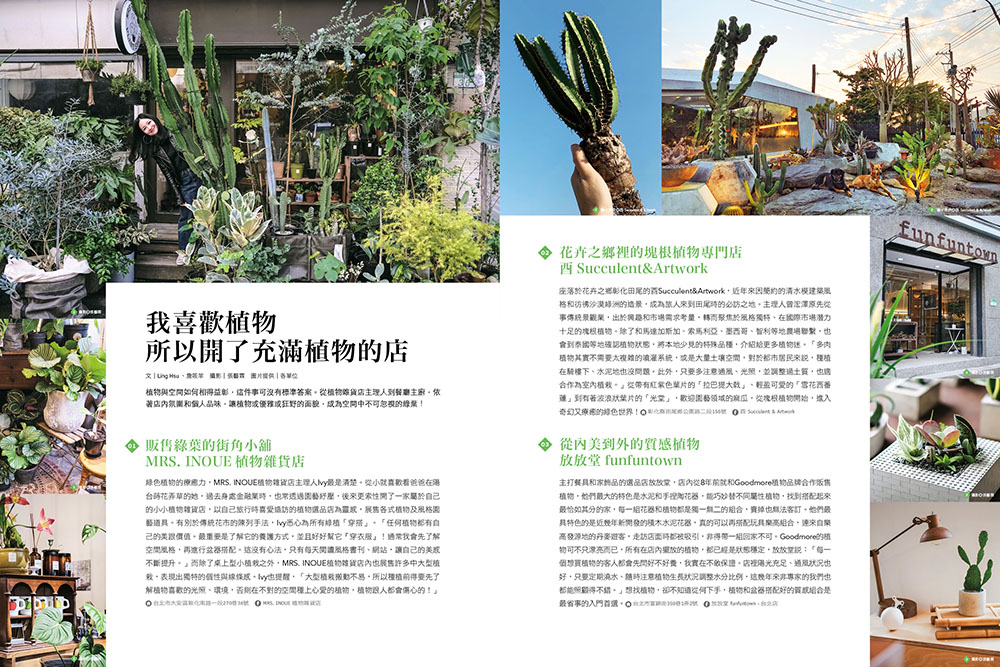 愛植物成癡者的家屋與店家、台灣最大植物產銷中心彰化田尾,讓你一窺近20年的植物發展脈絡,同場加映仙人掌、書店與多肉的神秘貿易。除了初階版的植物們,高階版玩家的收藏名單一次大公開,並帶你一訪世界最大植物方舟辜嚴倬雲植物保種中心,與城市中的植物珍藏地點。而在紙本上、展覽中,植物的文化與藝術性同樣迷人;更有不少現代建築將植物化作結構的一環。讓我們重新看待這些綠朋友們,找到自己的生活植物學。
