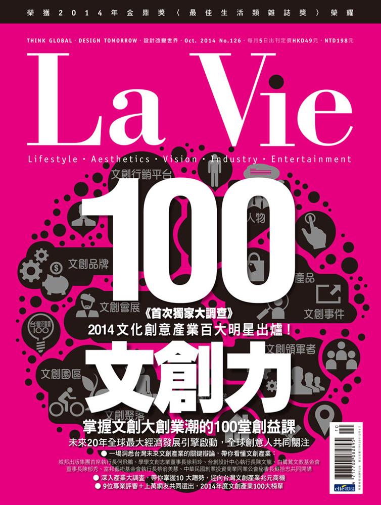 本期「台灣文化創意產業100大」首次獨家大調查,完整呈現當前台灣文創產業最亮眼的100大明星。同時,La Vie更邀請各領域專家共聚激盪出一場精采的文創產業年度論壇,針對當前台灣文創產業現況提出多元、一針見血的獨到觀點。La Vie期待藉由這樣的討論與思辯,提供台灣文化創意產業再升級更紮實的動力!