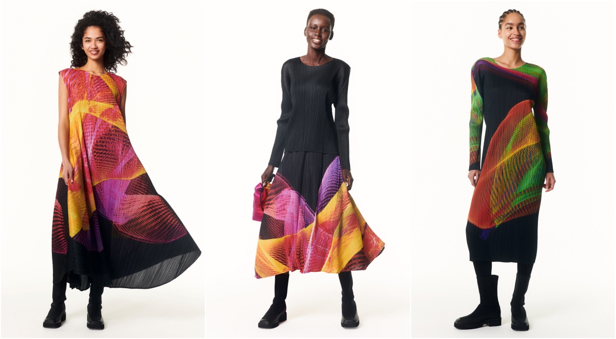 《SPECTRUM 系列》利用慢速快門速度拍下LED燈光的動態之美,宛如銀河與行星的光影變幻,轉化為服裝上絢麗印花,為 PLEATS PLEASE ISSEY MIYAKE 2024 秋冬系列的耀眼之作。裙子與無袖設計採用寬鬆剪裁,裙擺隨著穿著者的動作優雅展開,完美展現品牌經典縐褶工藝。特別適合年末時的派對、聖誕節活動等特殊場合, 為節日與日常穿搭增添趣味與巧思。